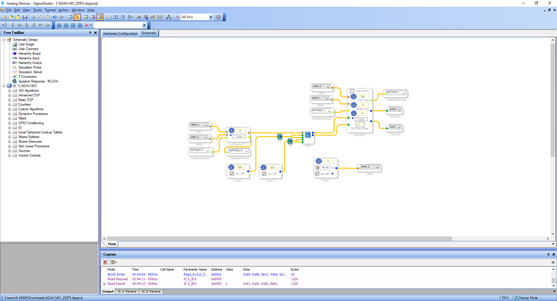 SigmaStudio+ADAU1401Sziasztok!Esetleg mostanában idetéved valaki, aki aktívan játszott a SigmaStudio+ADAU1401 (1701) párossal? Nem tudok rájönni, hogy miért nem sikerül a self-boot-os használat... Adott egy kommersz kínai modul, pontosan ez a verzió ami ebben a cikkben szerepel, hozzá egy hasonló de még előző verziós FX2LP script-el átlökve USBi módba. Ezzel nincs is gond, a SigmaStudio-ban kizöldül, programozza ahogy kell... Összeraktam egy saját játszós programot: egy 2 sztereó multiplexer amit a gpio0/1 vezérelne egy up/down control-on keresztül - egyik csatorna a bejövő analóg sztereó hang, a másik egy szinusz zaj - csak hogy könnyű legyen felismerni hogy mikor melyik van kiválasztva - ez megy az analóg kimenetre... Plussz mivel ott van a LED a gpio2-n ezért azt meg egy PWM jelgenerátorral piszkálom hogy mutassa hogy él a program, történik valami... A regisztereket is beállítottam a hw config oldalon - ha Link Compile Download akkor működik ahogy kell: LED villog, csatornát oda-vissza váltogatja a bemenet és a zajgenerátor között a gpio0/1 lábakat testelve De ezt hiába próbálom az EEPROM-ba iratni, valami nem stimmel: -WP és GND lábak közé jumpert teszek -EEPROM-ot teljesen töröltetem, biztos ami biztos -write latest compilation to E2PROM -check last compilation vs E2PROM sikeres -jumpert leveszem (ezt nem írja a cikk de kell mert blokkolja) -tápot elveszem, tápot ráadom Erre az eredmény: LED villog, analóg hangot átereszti magán, de se a gpio0/1-re nem reagál, se arra ha a hw config fülön ezeket a lábakat invertálással megpiszkálom. A többi regiszterre reagál, pl ADC vagy DAC mute, stb... Ha ismét rábökök a Link Compile Download-ra, akkor magához tér, reagál a gpio lábakra meg az invertálásra is... Magyarán félig működik a self-boot-ból vett program, de nem reagál semmi külső behatásra amíg ismételten a RAM-ba nem töltetem a Link Compile Download-al... Mit ronthatok el, mit értelmezek félre?