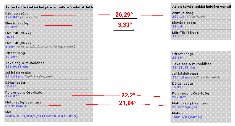 Utána számoltam, az azimut szögben igazad van, nem 20°, hanem 26,29° pontosan. Ezt sosem mérem szögmérővel, nem számoltam ki, valahogy úgy rááll a kezem, a sokadik után már. Az elevációs pedig 3,33°-al van lejjebb az Astra-hoz képest. Ezt egy beállított antennán elég jól kilehet számolni a rovátkák segítségével. Ha ez nagyon pontatlanul el van állítva (pl 5°), akkor már nem lehet megtalálni a vízszintes "kaszálásokkal".