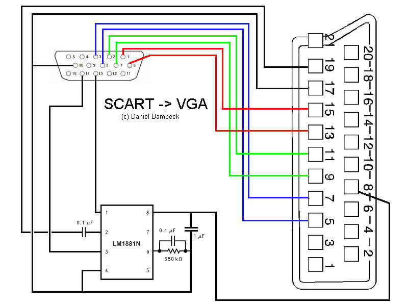 Ez a kapcsolási rajz, biztos, hogy jó, mert egy orosz fórumon valaki megépítette és nem működött neki. Ott azt írták, hogy frekvencia szorzó is kell bele. Egy dvd lejátszó scart kimenete lenne összekötve, egy lcd monitor vga(d-sub) bemenetével. Ha igen, akkor valaki fel is töltheti a gerber fájlt, ha megvan neki. Köszönöm!