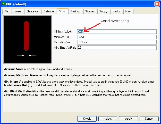 A parancsgomboknál alul találtok 1 olyat, hogy Drc klikk rá. A megnyíló ablakban menjetek a Restring fülre. Itt jobb oldalt találtok egy illusztrációt, amin egy furat található. Itt beállítható minden paraméter. Elsőnek ajánlom a Pads Top min. max. értékeinek módosítását. Min értékét 20-25-re tegyétek, az így a lehető legnagyobb lesz (IC esetén, rasztertáv), zárlat nélkül. Ha két furat közelkerülne egymáshoz, akkor a Distance fül alatt lévő Drill/Hole mezőben ez is állítható (persze IC esetén nem szerencsés).