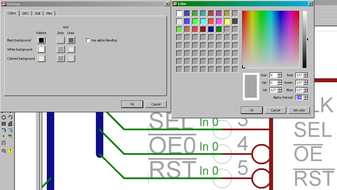 Igen, de ha átírom nullára akkor teljesen fekete lesz. Eddig még nem is annyira lenne talán baj, de hiába mentem el a színt, a kapcsolási rajz színe (vagyis annak "alpha blendingje") nem változik. Ha a "Display" gombbal megnézem az egyes rétegek színét, ott sem változik az amit előzőleg elvileg elmentettem.