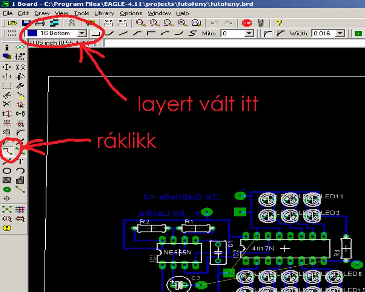 atvaltasz board nezetre(File/Switch to board),majd elrendezed az alkatreszeket kezileg ugy ahogy szeretned(itt fontos hogy ugy forgasd az alkatreszeket,hogy konnyen tudjon routolni,ne legeynek x -ben a vezeto vonalak),utanna meg: Tools/Auto ,ez kesziti a nyakrajzot."