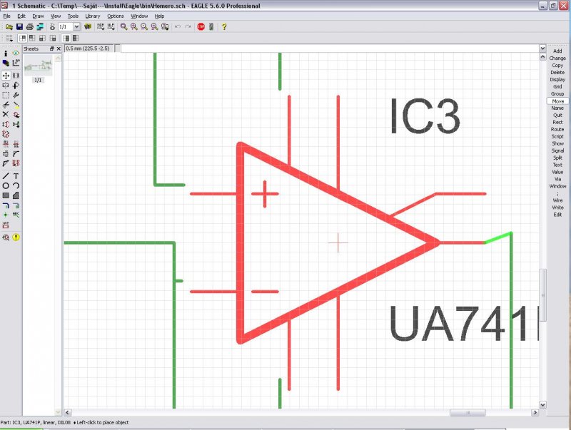 Lehet, hogy az alkatrész nincs raszteren, töröld ki és tedd le újra. Vezetékezés közbe ha nyomod az ALT-ot, akkor a girdben beállított finom beosztást tudod használni. A vezetéket az 741 lábáról indítsd. Ezek közül valamelyik csak bejön. Minden más alkatrészt be tudsz kötni?