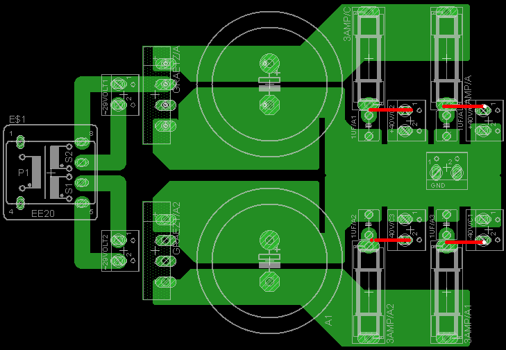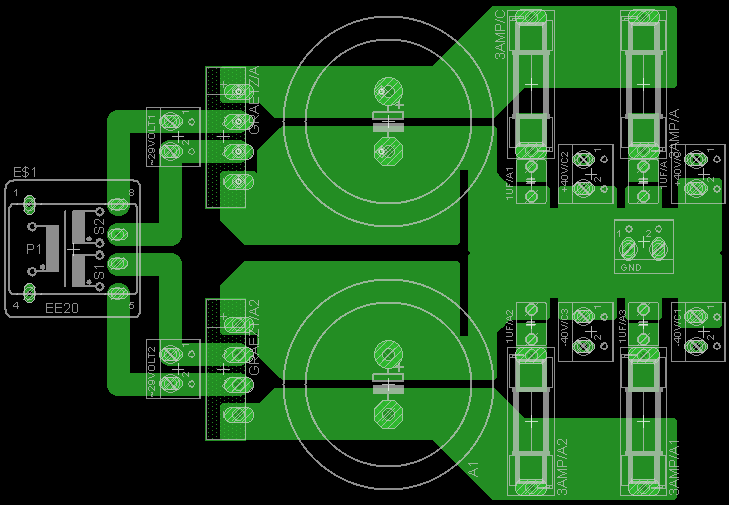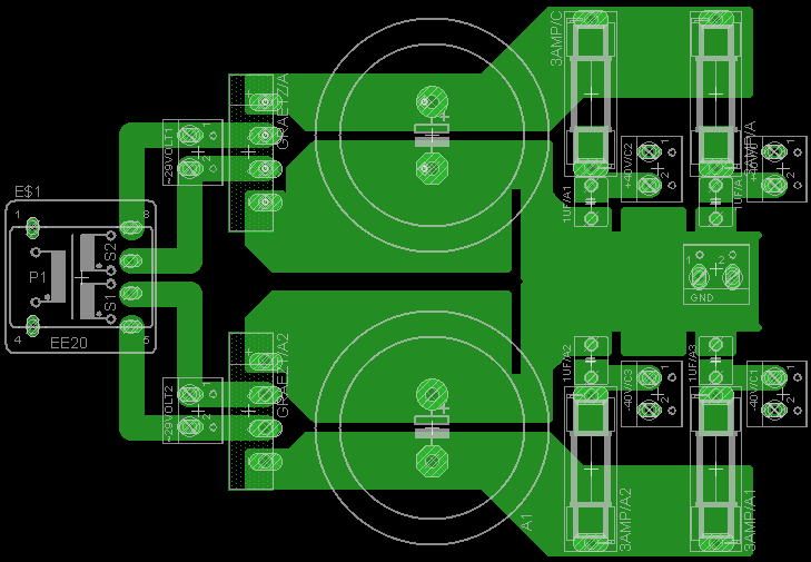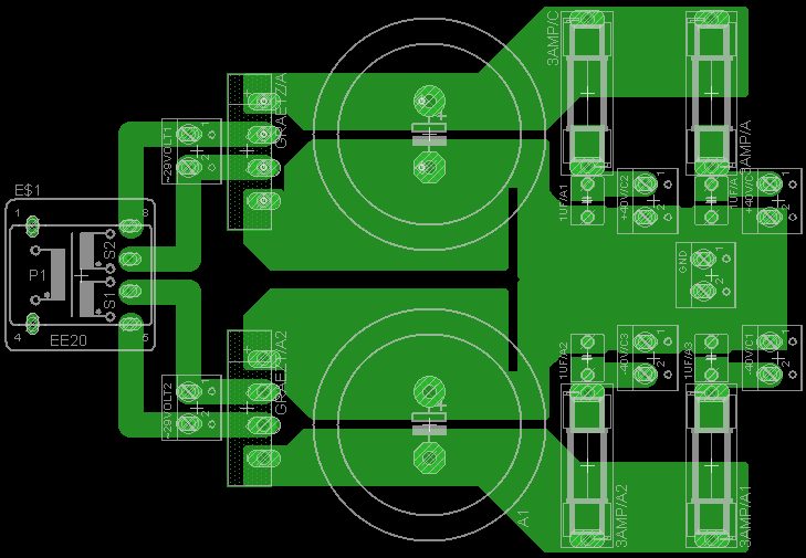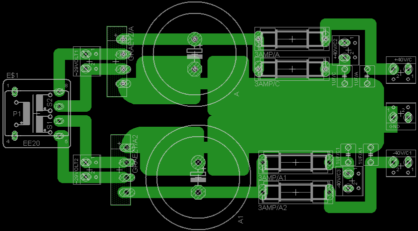 Vf2 építésére adtam a fejem. A táp szimetrikus +-40 Voltos lesz egy +-29Voltos kb 350Wattos toroid trafóról táplálva. A táphoz csináltam egy nyáktervet Eagelben, de mivel ezt sohasem tanultam így megkérnélek titeket, hogy nézzétek át és az esetleges hibákat, javítanivalókat jelezzétek. Előre is köszönöm.