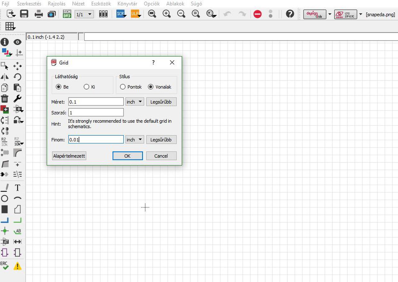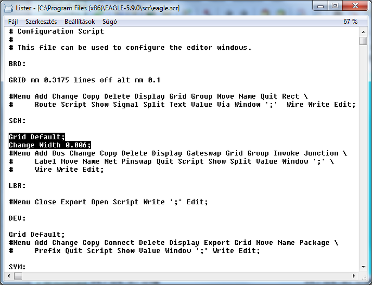 Megnyitod szerkesztésre a C:\Program Files (x86)\EAGLE-5.9.0\scr\eagle.scr fájlt és megkeresed benne „Grid Default;” részeket, kettős keresztel kikommentezed és beírod helyette : GRID mm 1.27 lines off alt mm 0.635 Értelem szerűen a BRD: rész a paneltervező, az SCH: kapcsolási rajz tervező beállításait tartalmazza. Persze a méreteket tetszésed szerint átírhatod!
