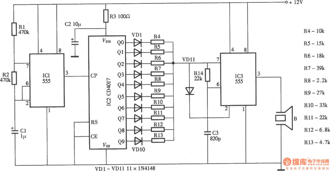 Biztosan igazad van, mivel az egész kompletten 60 mA vesz fel 12 V-os aksiról az nem nagy teljesítmény. Én csak elkészítettem a kapcsolási rajz alapján. Én megcsinálnám ahogy írod,de nem értek hozzá csak hobby célból foglalkozom az elektronikával. Ma volt egy kis szabadidőm kipróbáltam bekötöttem mind a 9 kimenetét így 9 különböző frekvenciát ad le, de a teljesítmény nem változott maradt a 60 mA. Esetleg egy ilyen vagy ehhez hasonló kapcsolás nem kellene e? a piezó elé amelyet mellékelek. Balu.