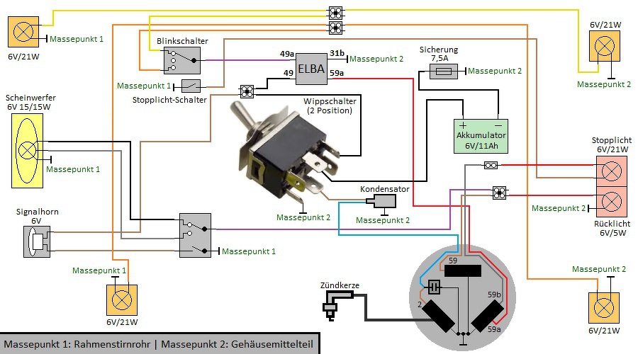 Van egy Simsonom, ami teljeskörű felújításon esett át, beleértve a vezetékelést is. Minden jól működik, kivéve az irányjelző lámpákat. A kapcsrajz1.jpg alapján készítettem a kapcsolást. Abban az esetben, hogyha az irányjelző kapcsoló lilával jelölt vezetékét közvetlenül az akkumulátor pluszra kötöm (tehát az ELBA kimarad az áramkörből), akkor az irányjelzők is működnek (persze nem villogva, hanem folyamatosan világítva). Emiatt arra tippelnék, hogy az ELBA indexrelé része hibás. A kérdésem az lenne, hogy hogyan tudnám leellenőrizni, hogy a feszültségszabályzó legalább működik-e? És, hogyha működik, megoldható-e az, hogy veszek egy külön indexrelét és az ELBA feszültségszabályzós részével együtt használom, ahogy a kapcsrajz2.jpg mutatja?