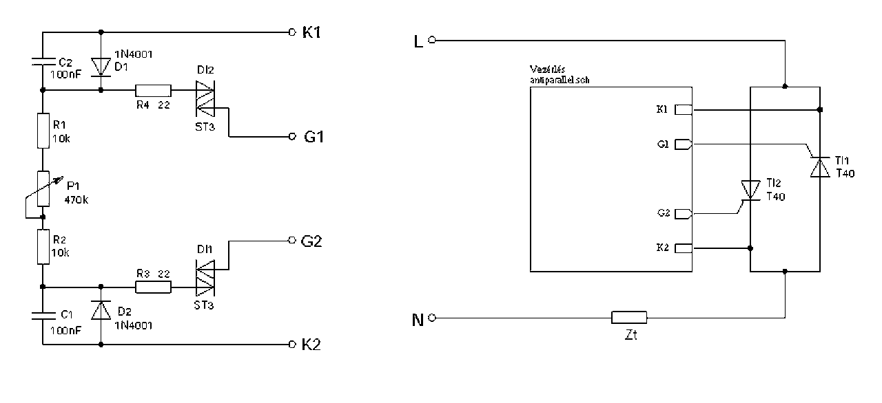 Egy triak nem abból áll, hogy ellenpárhuzamosan van kötve két tirisztor. Ez annál komplikáltabb, egy integrált áramkör szintű dolog. A kéttirisztoros kapcsolás a mellékletben.