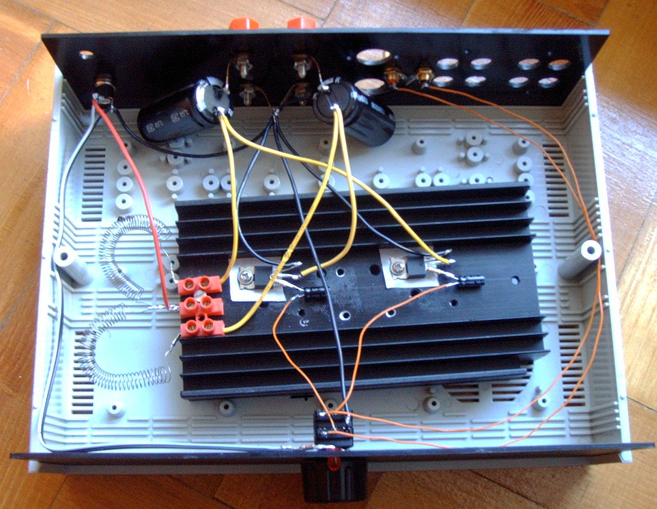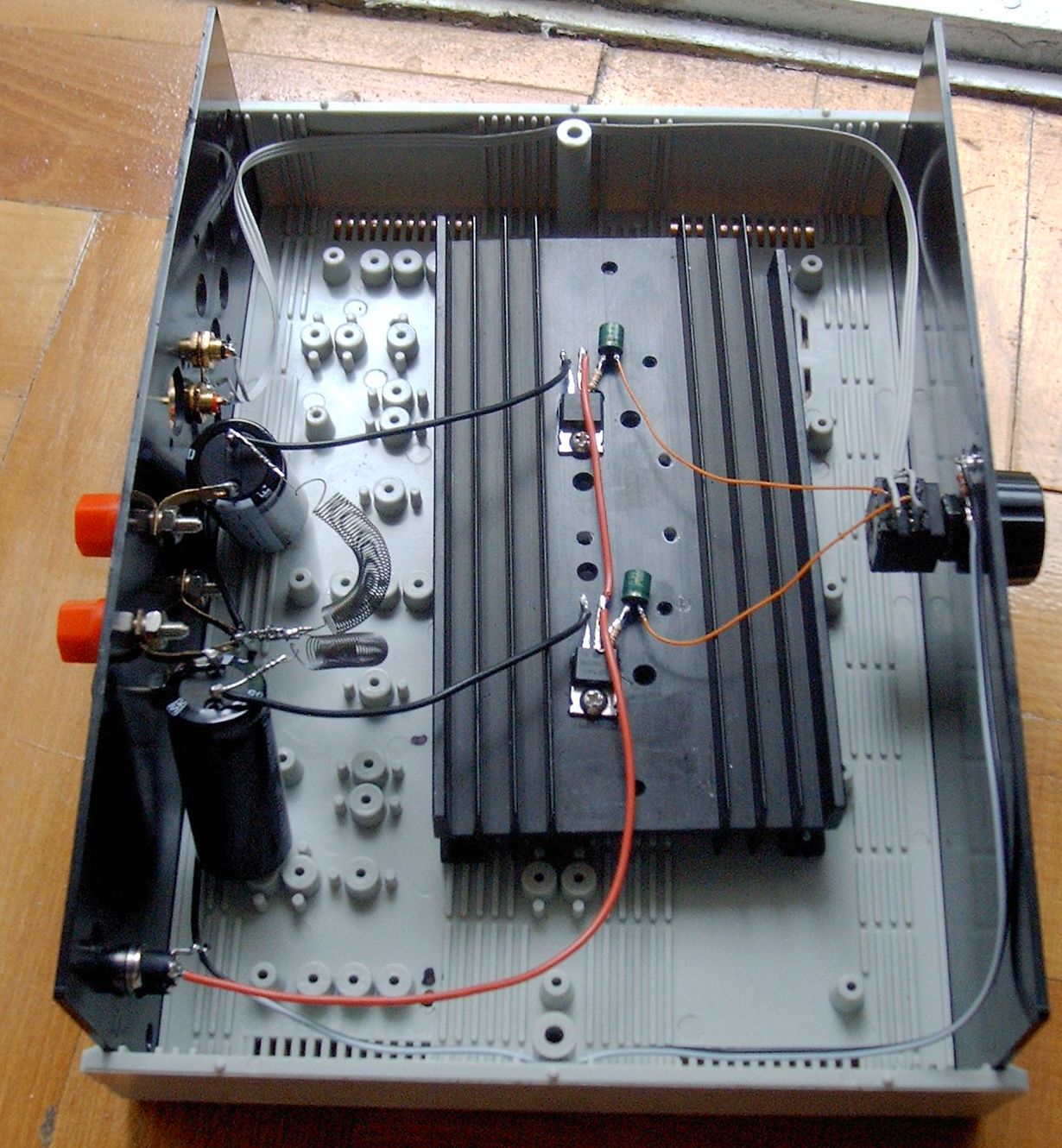 Na itt van egy új változat, aminek az az előnye, hogy a feteket nem kell elszigetelni a bordától ( ha a borda szigetelve van a földtől ) így jobb lehet a hűtés és egyszerűbb a szerelés. Én most építettem át az enyémet, a hangja nem változott szerintem, ugyanolyan szép, vagy talán jobb is lett kicsit. Mindenesetre sokkal szebb lett belül, du. teszek fel képet.
