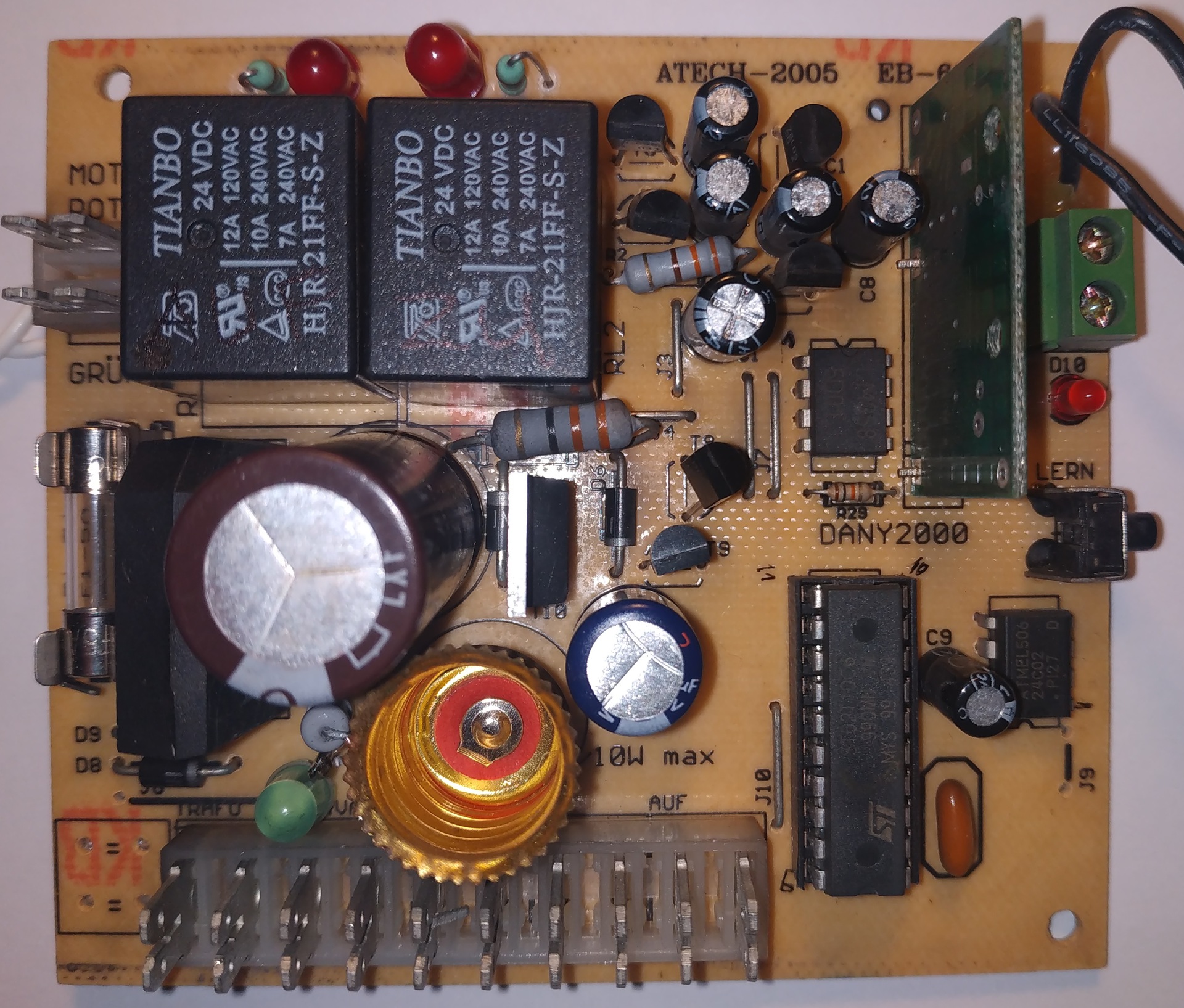 Egy ilyen garázskapu nyitó panel került hozzám javításra, de nem boldogulok vele. Az asztalomon összeraktam, terhelés hiányában szépen működik, távval "kinyit", végállást összezárom leáll. Másik irány ugyanezt csinálja. Ekkor jön a bonyodalom, ráteszem a 8ohm-os terhelést, az egyik irány szépen működik, mint fent, de a másik irány a következőket csinálja: relé behúz/relé elenged-másik relé behúz/elenged.