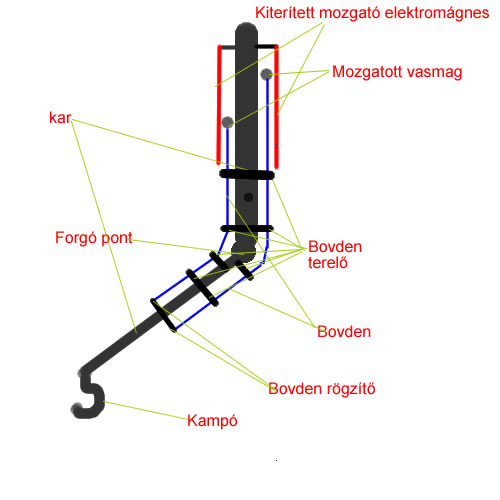 a rögzített karhoz képest kiterített mozgató elektro mágnesekkel. A bovdenek végén egy egy vasmag vagy valami mágnesezhető lenne!