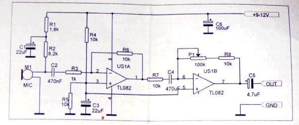 A "Szuperfül" kapcsoláshoz nem volt IC a környező boltokban, így kerestem és találtam egy hasonlót, TL082 IC-vel. Az R6 és R8 ellenállásokkal próbálgattam beállítani az erősítést, a szívhangot már egész szépen lehet vele hallani, de zajos már ekkor.(Erősítőre kötve természetesen). Kérdésem az lenne, hogyan oldható meg a lehető legnagyobb erősítés, viszonylag kis zajjal? Esetleg egy tranzisztoros elő fok? Köszönöm!