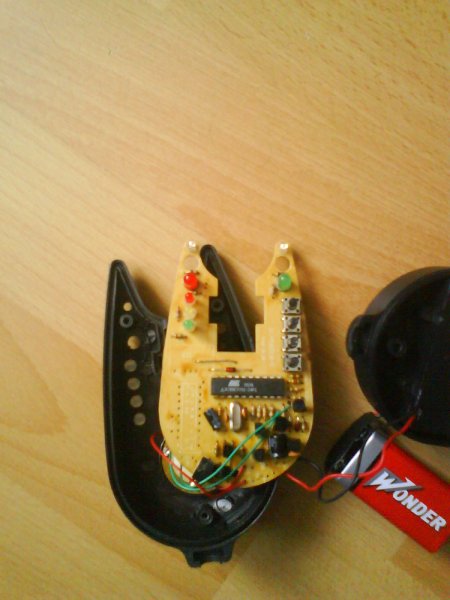 Valamivel jobban látszik, de nem egészen jól. A gondom az, hogy eddig amit láttam (mind az egyet), ott a damilt érzékelő tárcsán volt egy pille, és ezt érzékelte egy optokapu.Itt viszont, nem látom az optokapu elemeit (adó-vevő). Ezek általában kétlábú áttetsző Led-nek látszó dolog, ami a tárcsa forgását érzékelték. Itt viszont, szerintem Reed relé cső van használva erre acélra. Tehát a tárcsában valami mágnesnek kell lenni. (Kis üveg cső, belőle kiálló két vezetékkel. Ha mágnest közelítesz hozzá, belül a két érintkező összeugrik. Ha jó a füled, hallod is, főleg mikor elveszed a mágnest.) - Ha így van, akkor mérd meg, hogy a Reed cső melyik felén van + és - feszültség. Ha ezt a két pontot rövidre zárod, akkor jelezni kell a kapásjelzőnek. - Ez után, a telep negatív lábához képest mérd meg a Reed cső két felén a feszültséget a cső nyitott állapotában, majd zárt állapotában. Ebből el lehet dönteni, mit hova kell kötni. üdv! proli007