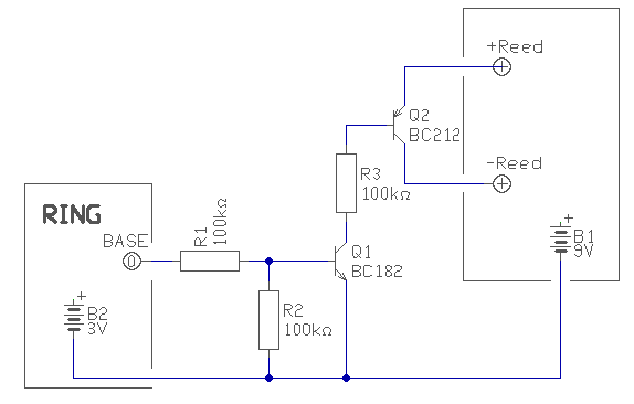 Akkor, nem elég egy tranyó, hanem kettő kell. Tök mindegy milyen, csak az egyik NPN, a másik PNP legyen. Az ellenállás értékek sem számítanak különös képen, de jobb ha 100kohm felett vannak. Az első kettő, ha lehet egyforma legyen a bázis feszültség szint miatt. A két telep negatív pontját össze kell kötni, mint a rajzon is látható. üdv! proli007