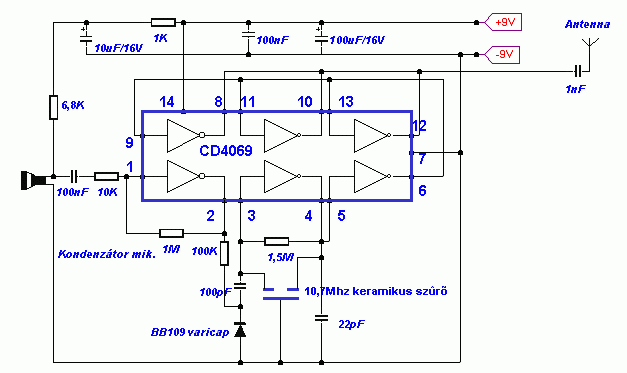 Ez a kapcsolás nem igazán trartalmaz semmilyen elemet ami egy adóra hasonlít. Ahogy nézem a 10,7 Mhz felharmonikusain szór. Nem nagyon lehet hangolni, csak rezonátor cserével.