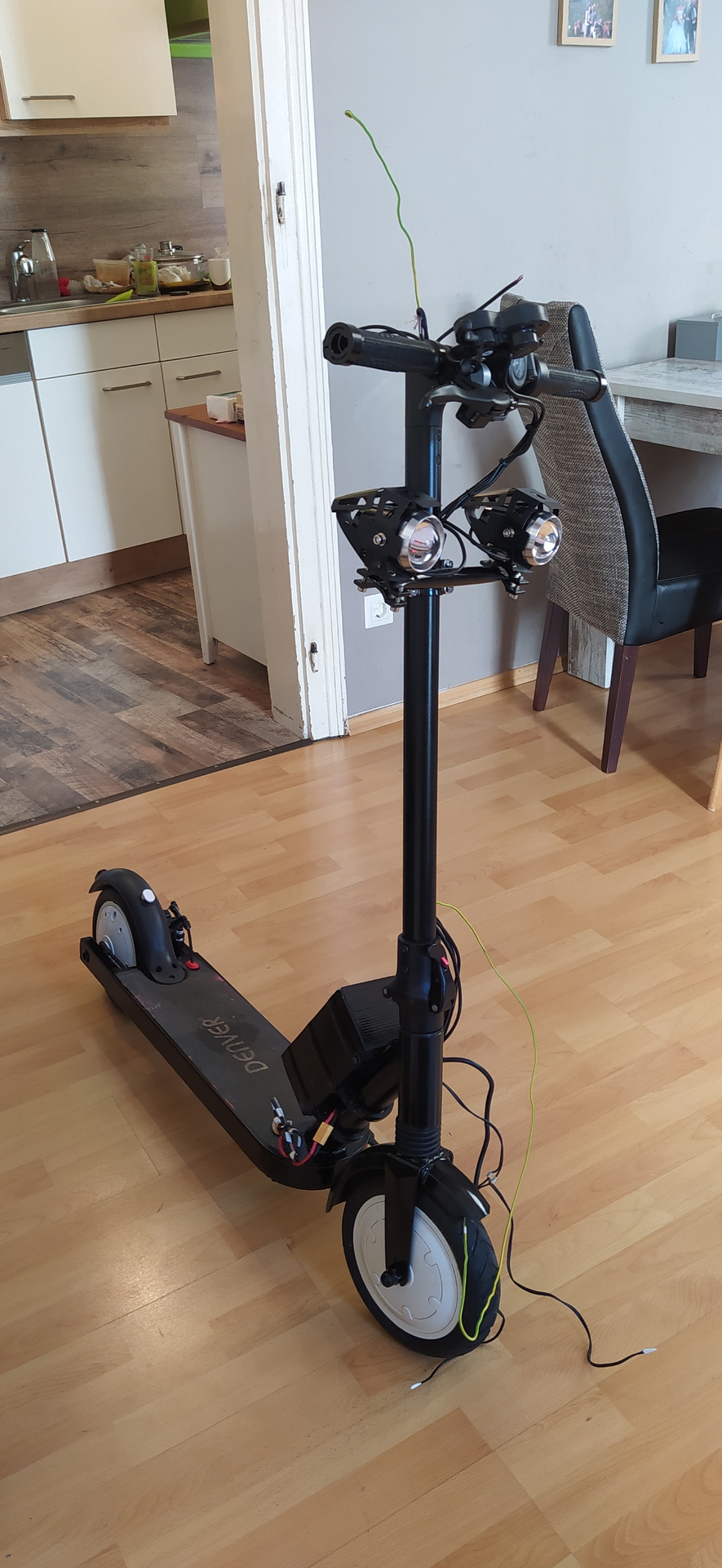 Azóta a kábelek szépen el vannak rendezve, kaptak védőborítást is. A grip tape le lesz cserélve. Az egész roller szinte újjá lett építve, csak a hátsó motor és a váz az eredeti. Le lett az egész feketére lakkozva, a felnik fehérre.