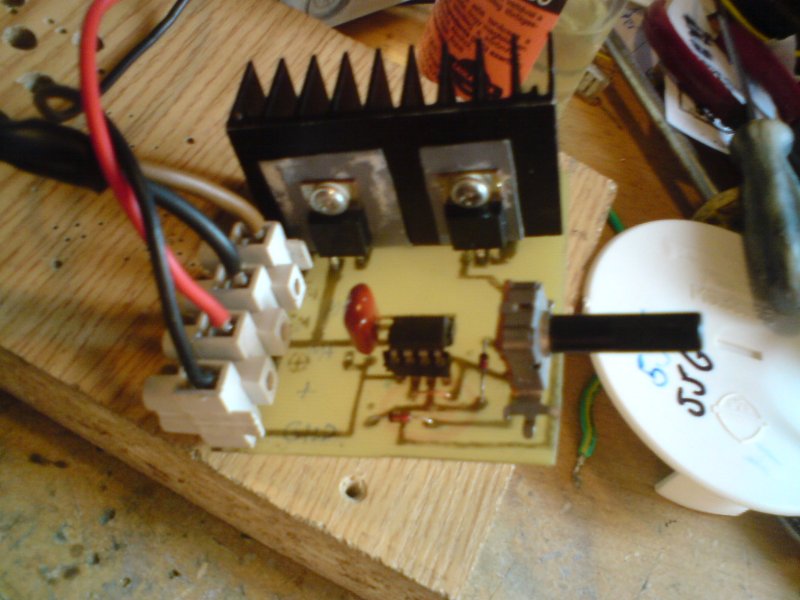 FETtel tényleg jól működik. Egy érdekességre lettem figyelmes. Ahogy fokozatosan több "gázt" adok, szépen emelkedik a fordulat. Ám a vége felé, akár milyen finoman tekerem hirtelen megugrik a motor, és úgy gyorsul még tovább picit. Miért lehet ez? Másik: Az nem baj, ugye, ha én a 100nF-os kondit 68nF-osra cseréltem? Valamint az 5-ös lábat lehúztam egy 10nF-ossal a földre? (másik rajzon láttam, hogy ott meg rajta van.) A FET picit jobban melegszik, mint gondoltam, de remélem egy kis 4*4es venti megoldja majd a gondot. Diódának egyelőre ideiglenesen raktam be egy BYW 29-100 nevezetűt. Annyit tudok, hogy kapcsitápban volt, tehát gyors. Tokozása alapján nem 1 A-es darab. Remélem jó lesz. szerk: utánanéztem: 100V 8A. Egyelőre, míg nem építem be, megteszi. Mostmár el kéne kezdeni a mechanikán is dolgozni. De van egy kis gond (ismét): A motor tengelye kissé kúp alakú. erre nehéz lesz esztergáltatni nem? Holnap lefényképezem, mennyire vészes. Addig is a vezérlő: uli Szerk: a nyák elég ocsmány lett, kezd kifogyni a filcem