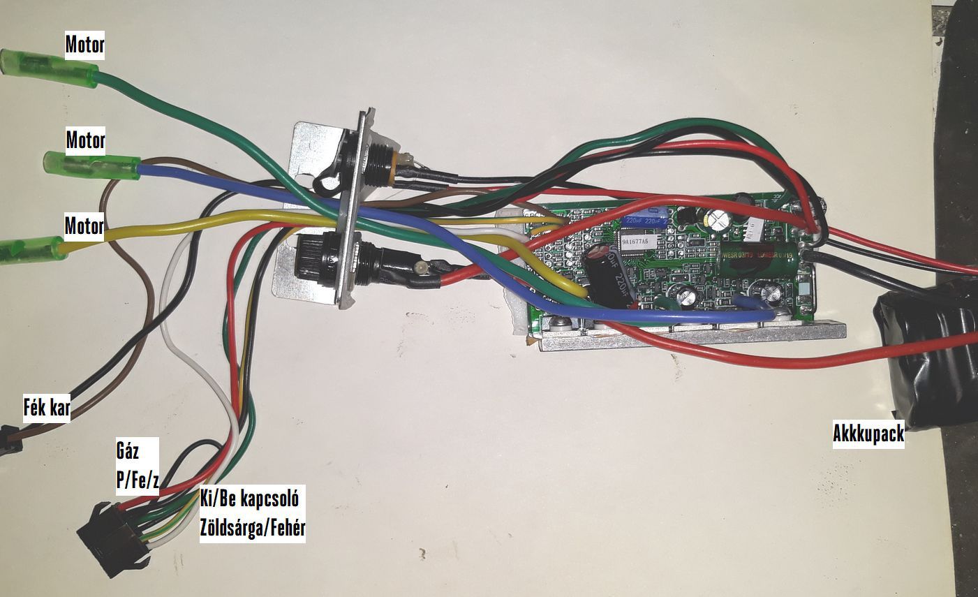 (Elejétől)-ez volt elektronikája-nagyon szét égett,akkor azt mondták a "szakik",hogy nem tudják azonosítani az alkatrészeket,újat készíteni meg nem éri meg többe kerül mint az egész roller a szervizbe meg csa 250W-os ig volt.(cc 10 évvel ezelőtt)Akkor nekem a pc még kínai volt,úgy hogy nem tudtam utánanézni vagy keresgélni sehol.Akkor egy akkus csavarozó elektronikájával működtettem, bovdennel oldottam meg de nem volt az igazi.be kellett lökni utána húzni a gázt akkor nem égett le .A még régebbi 7,2V meg 9 V csavarozókba 20A-os van az jobban bírta.Akkui is tönkrementek úgy hogy félre tettem mostanáig. Nem gondolom hogy a régi gázkar jó lenn az új elektronikához( vagy mégis)