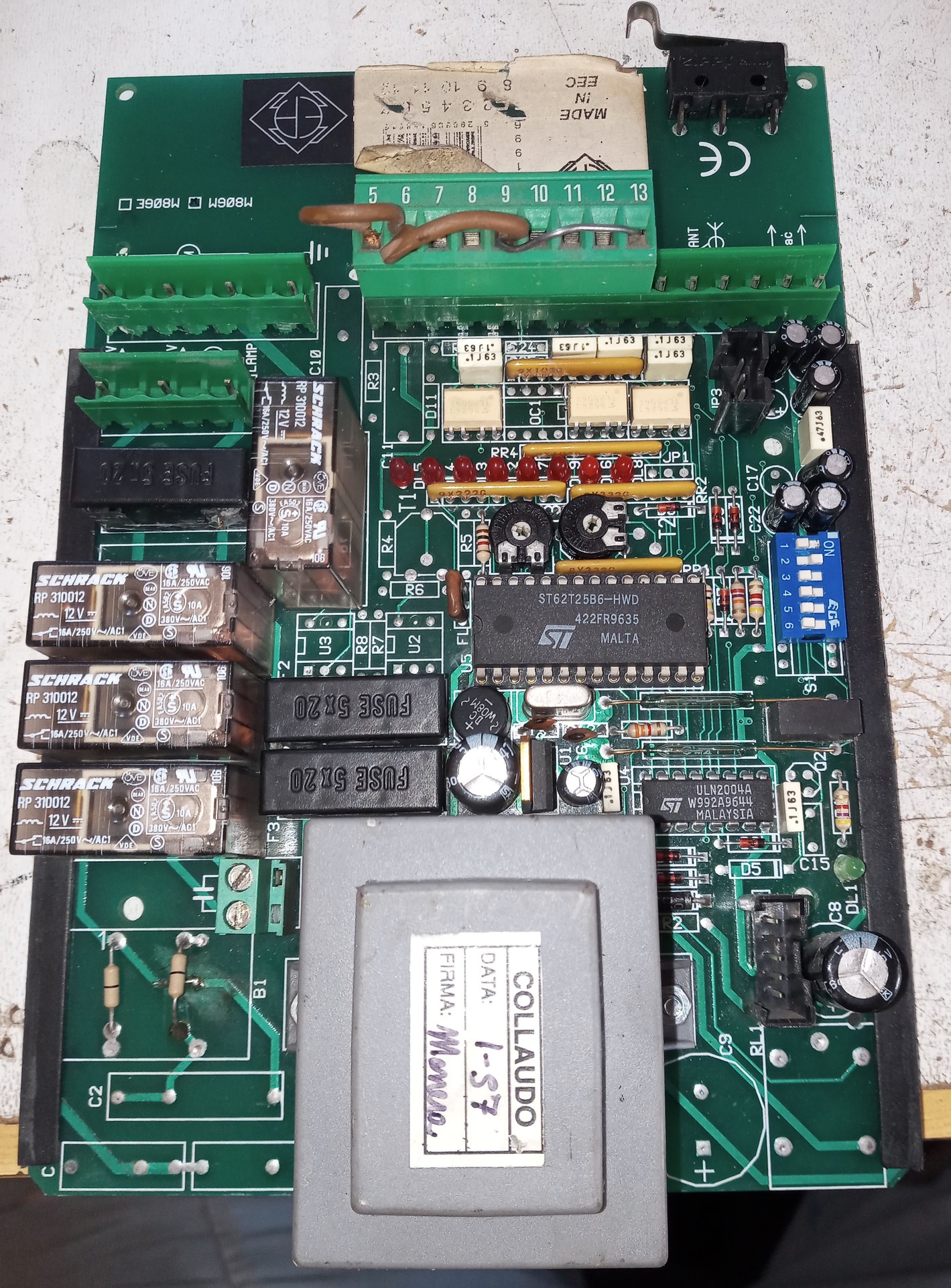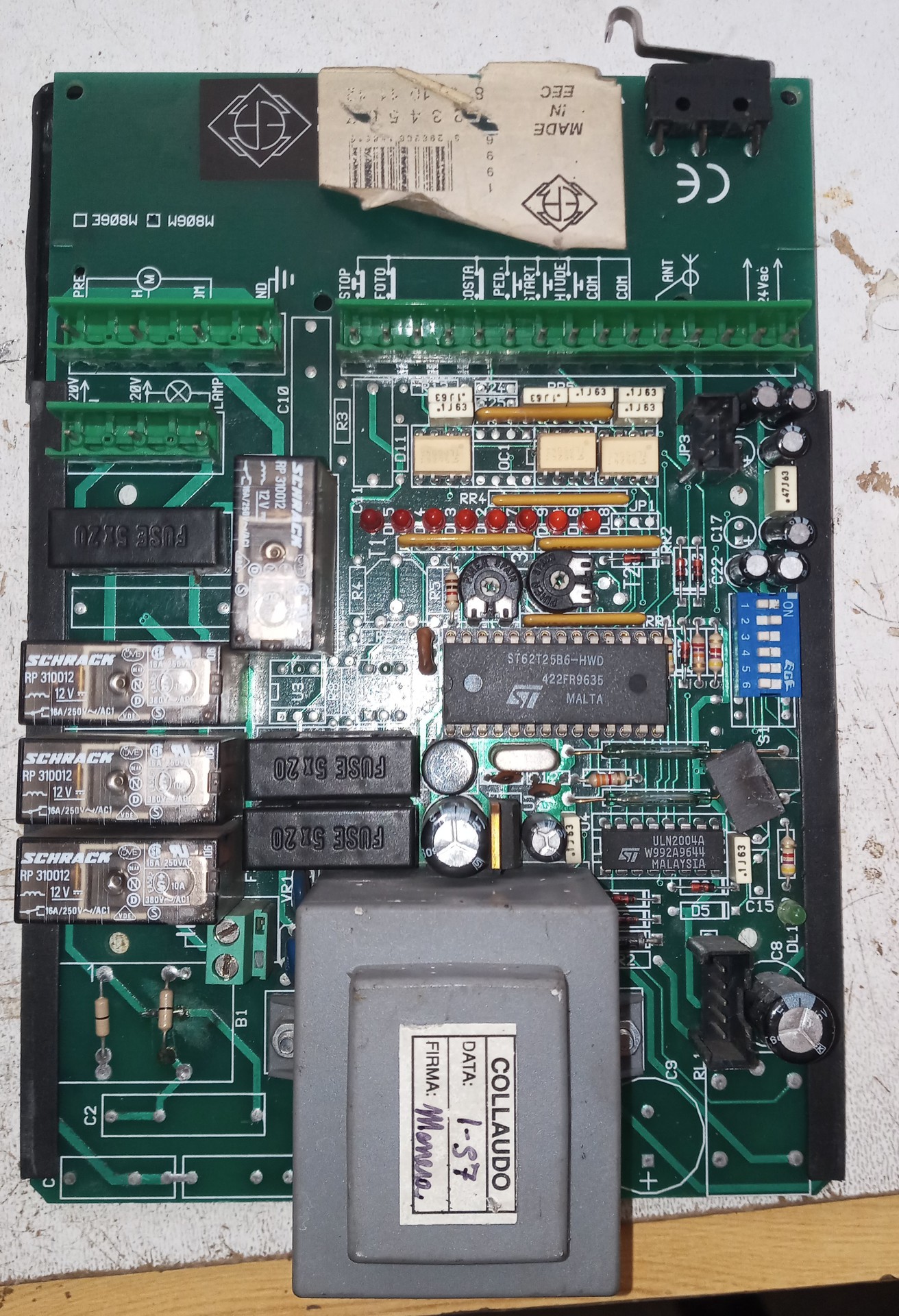 A ledek világítanak. Balról jobbra az első 5 led világít. A többi három csak akkor, ha valamelyik bemenetet Com-ra zárom.Így alaphelyzetben, a reed relék zárva vannak, mágnesre reagálnak, a vissza jelző ledeken látszik. Van egy 24v Ac kimenet, azon is meg van a feszültség.A proci 5v-os feszültsége is meg van. A tulaj azt mondta,hogy este még be tudta csukni a kaput,reggel meg már nem nyílt ki.Lehet hogy kiforrasztom a kondikat és átmérem őket,mert már több min 20 éves a cucc.