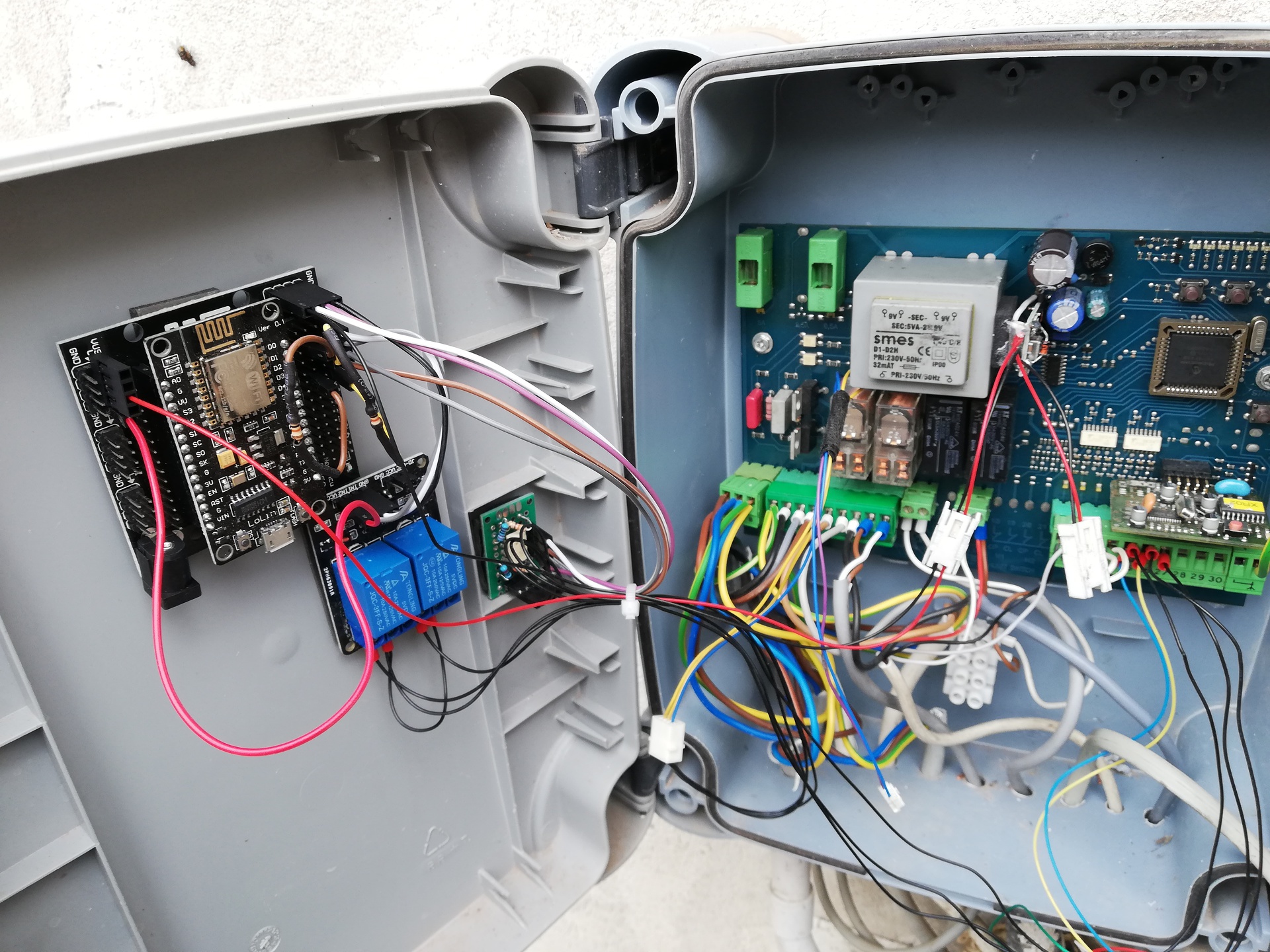 A bal oldali rész amit beépítettem, a két relé a teljes nyitás/személyi bejárót kapcsolja, + van két opto bemenete, hogy tudjam, most éppen kinyit vagy becsuk.