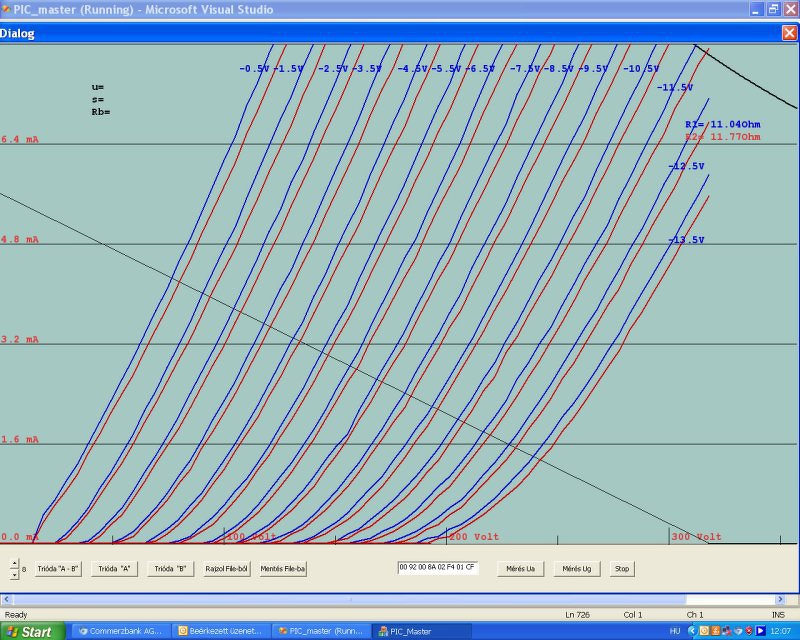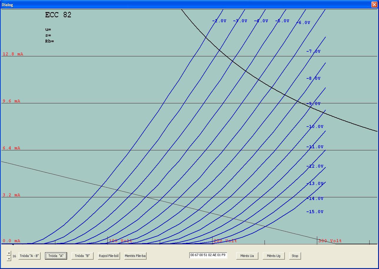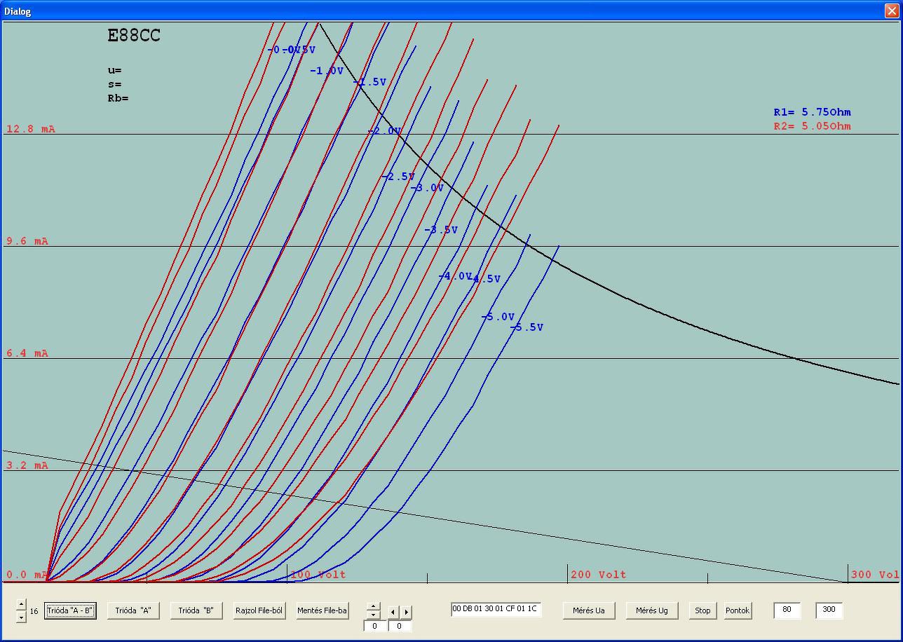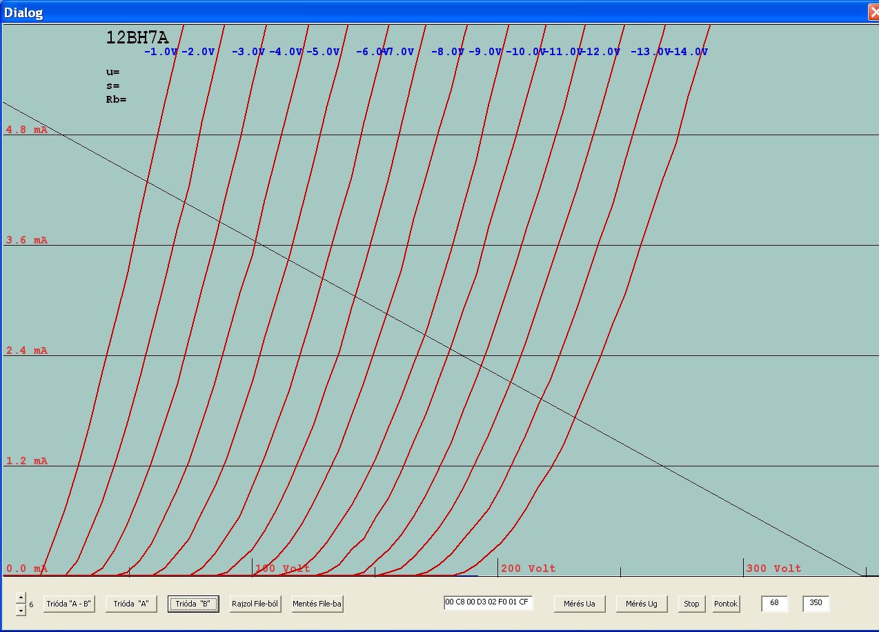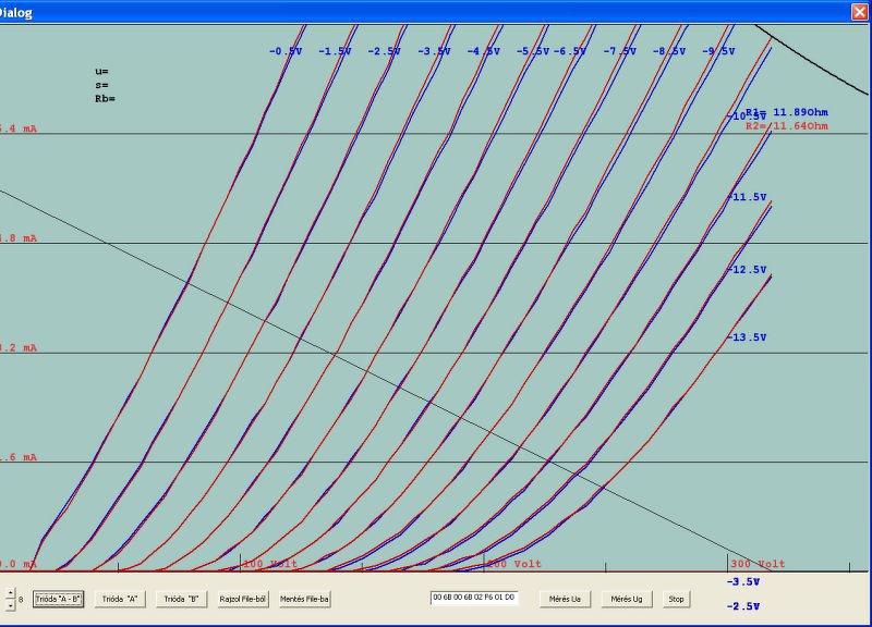 Az előzőekből az egyik 6mA -es méréshatárban, első képen mindkét triódafél, a másodikon csak az egyik fele, és már a munkaellenállást is be tudom rajzolni, jelenleg 350V/68kOhm.