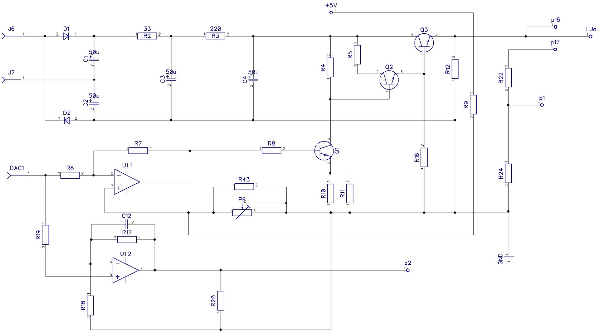 A DAC kimenetén 0 --> 2,047 V állítható be, és ebből egy műveleti erősítőn és a nagyfeszültségű tranzisztorokon keresztül 0 -> 300V jelenik meg a kimeneten.