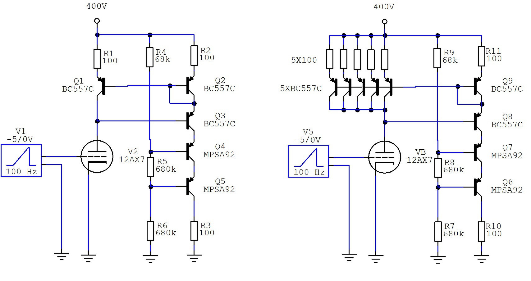Ez az áramtükör is megteszi. Ráadásul gyorsabb, és pontosabb mint egy optocsatolós valami. Ha nagyobb áramot mérünk, akkor érdemes a tükrözési arányt módosítani, mivel nem hasznos ha egy 100mA-es anódáram miatt még egy 100mA-es valami terheli a tápot. Egy példa hogy ilyenkor sokszorozzuk a tükör felét.