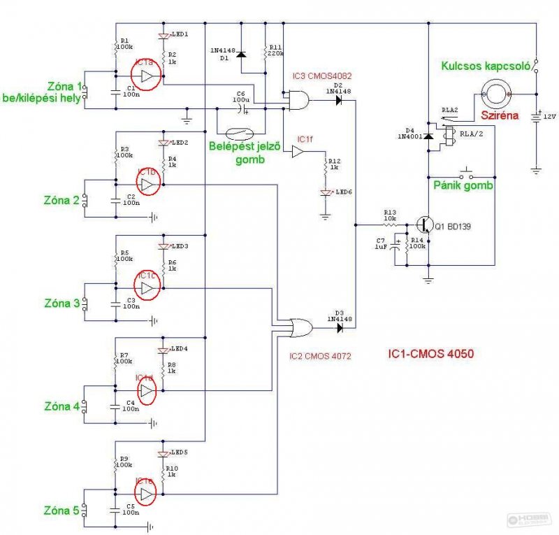 Meg szeretném építeni a kapcsolásokban lévő 5 zónás lakásriasztót. A kérdésem az, hogy a képen bekarikázott alkatrész mi, és, hogy az 1N4001-et mivel lehetne helyettesíteni? Üdv: Balázs