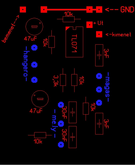 Megterveztem a NYÁK-ot. A potenciométereket be kell huzalozni, de azért igyekeztem könnyen érthetően elhelyezni a forrszemeket, szépen sorban. Ahogy a potenciométeren is vannak.