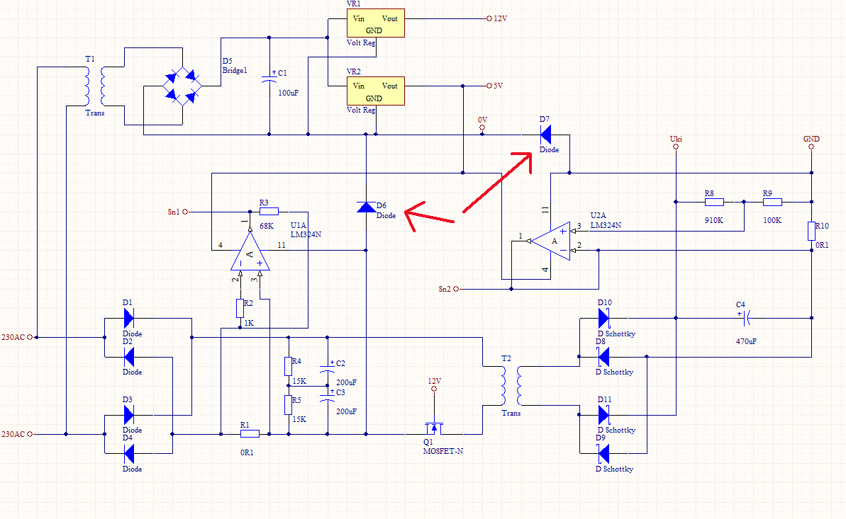 Egy nagyon szimpla, kísérletszerű kapcsolóüzemű tápegységet tervezek éppen. A képen látható, hogy lesz egy segédtáp, mely olyan áramkörök tápellátásáért lesz felelős, mint pl.: a kapcsoló FET PWM jelének előállítása stb... A problémám az lenne, hogy mind a Primer, mint a Szekunder oldalon levő áramot, feszt mérni akarom műveleti erősítők (nem feltétlenül LM324, bármilyen olyan, aminek nem kell szimm.táp) segítségével, majd AD konverterrel, vagy PIC-el. Tehát mind a 2 oldal, és a segédtáp nulláját, valahogy közösíteni kellene. Előzőleg már óva intettek, hogy nem köthetem csak úgy össze a Primer, Szekunder és a segédtáp 0-ját, mert ugyan nem okozna nagy gubancot, de nagyon veszélyes. Kérdésem az lenne tehát, hogy a piros nyilakkal jelölt diódák (D6; D7) kiküszöbölnék-e ezt a problémát, ugyanakkor emellett a műveleti erősítők működni fognak-e? A rajz még egyenlőre hiányos, apróságokat ne figyeljetek, a FET azért van 12 volton, hogy szemléltessem, honnan kapna feszkót (persze szaggatva). Tehát működne e mind a Műv.Er.-k, mind a FET, és még énis életbe maradok-e?
