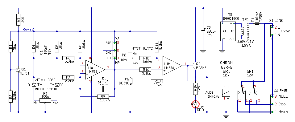 Van egy kapcsolásom (mellékletben feltöltöm), amely arra jó, hogy egy bizonyos hőmérséklet elérésekor elkezd egy LED-et vagy izzót villogtatni (de hangjelzésesre is meg lehet csinálni állítólag). Én úgy szeretném átalakítani, hogy a hőmérséklet elérésekor meghúzzon egy relét az áramkör, ehhez hogy lehet átalakítani a kapcsolást? Ebben a formájában a szaggatott feszültség miatt gondolom nem lehet relét rákötni. Magamtól megpróbáltam úgy, hogy a kondenzátort és T3 tranzisztort (meg persze az izzót és a hozzá tartozó előtétet) kihagytam belőle, de így nem kapcsol a hőmérséklet-változásra.