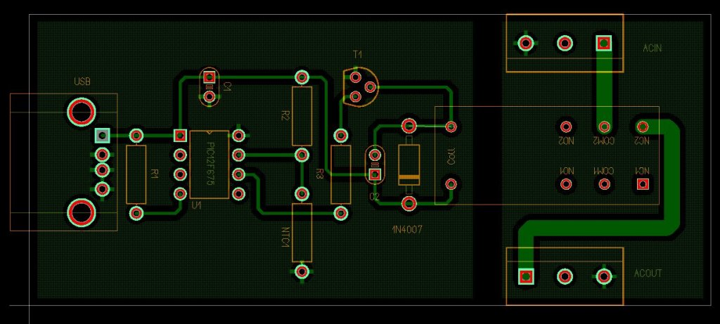 A csatolt áramkör helyesen van megtervezve? (egy analóg bemenetet olvasva a hőmérséklet függvényében kapcsolja vagy nem kapcsolja a relét). A PCB-n az AC vezeték 80mil széles. Ez elég? Milyen tervezési hibákat vétettem, illetve hogyan lehetne kiküszöbölni őket? A digitális rész egy fali USB tápról kapná a ménkűt. köszönöm a segítséget.