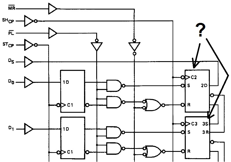 Idézet: „A felső egy kombinált flip-flop aszinkron R és S bemenetekkel, ill. negatív élvezérelt (szinkron) D bemenettel.” Ez lehet egy CD4027-es FF aminek a JK bemenetiből egy D bemenetet csinálunk? Idézet: „Az alsó egy aszinkron és szinkron (negatív élvezérelt) beírású SR flip-flop. (A 3S és 3R bemeneteket a C3 órajel kapuzza.)” És itt is a CD4027essel lehetne folytatni, csak annyi, hogy a JK-ból nem D bemenetet csinálunk, hanem egy shift regisztert valahogy így?: FF0 Q->J FF1 Q->J FF2 Q->J FF3... stb. FF0 Qn->K FF1 Qn->K FF2 Qn->K FF3... stb. CD4027-es adatlapja 5. old 4. ábra A FF adatlapján az 1. oldalon az első ábrán "Schematic and Connection Diagrams"-ban az a TG-s négyzet amibe az órajel és a negáltja megy bele az micsoda? SB