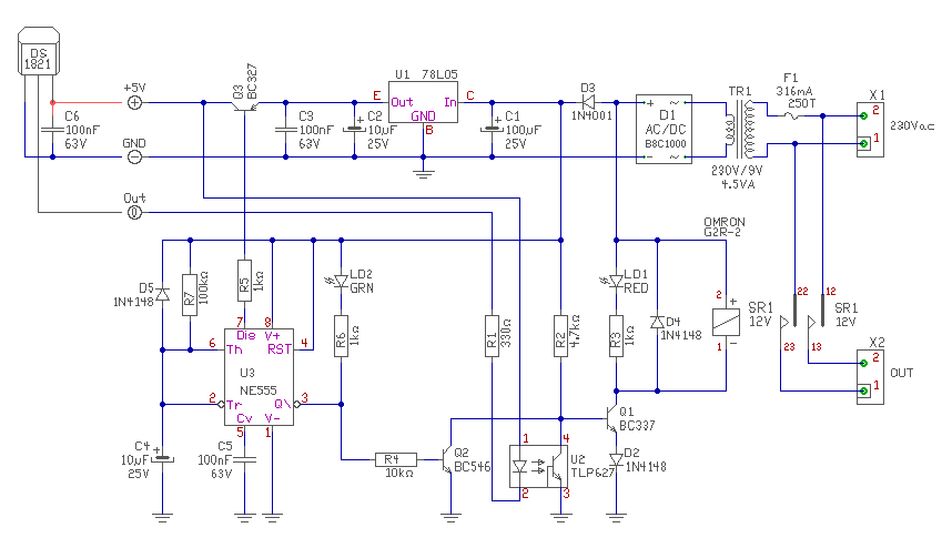 - A kép baloldalán a műszer csak a szimuláció miatt kell, az méri a feszültséget, az ellenállás pedig a DS és az opto fogyasztását helyettesíti. - Egyébként a két csatornára nem kell két stabi és tápkapcsoló áramkör, bőven megteszi egy is. De egy 100nF-os kondit tegyél a DS lábába közvetlen, mert lehet pont azt hiányolja a DS. üdv! proli007