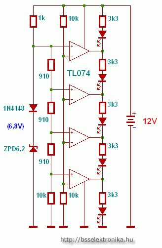 Azt hiszem megoldódott a gond! Ha igaz és jó amit összeraktam, akkor csak egy led világít egyszerre, a telep töltöttségének megfelelően. Ami nálam hiba volt, és zavart okozott, hogy egyel nagyobb zener dióda került bele, mint kellett volna. Nem figyeltem, rosszat vettem elő hozzá. Mennyi időt megspórolhattam volna, ha jobben figyelek! Azért köszönöm a korábbi segítséged!