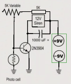 5k ohm -os (ha nincs akkor 4,7Kohm-os) potenciométer, vagy trimmer poti Valamilyen fényérzékelő ellenállás (LDR) 9v-os feszültség forrás (elem, vagy labortápegység) 12V-os csipogó vagy sziréna. (Ha jól látom, beépített gerjesztő áramkörrel.) Tranzisztor:BC337 Bővebben: Link Elkó: Bővebben: Link LDR: Bővebben: Link Csipogó: Bővebben: Link Poti: Bővebben: Link (Trimmer: Bővebben: Link )
