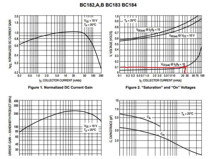 Köszönöm a választ ! Annyi lenne még , hogy ha a bázisáram 5x nagyobb az nem árt a lednek vagy csak annyi áramot vesz fel amennyire szüksége van?Illetve , becsatoltam grafikonokat bc 182-es tranzisztornak az adatlapjáról , mert felmerült bennem néhány kérdés.Az 1-es grafikonon kell úgy tudom a bétát olvasni(DC current gain) , de hogy lehet , hogy itt csak ilyen (0,2 , 0,3 .... 1,0) kicsi?Illetve a 2-es grafikonról lehet leolvasni a szaturációs feszültséget , ha igen akkor az a metszéspont vonatkozik erre a kapcsolásra , amit bejelöltem , ami 100mV , ahogy mondtad.