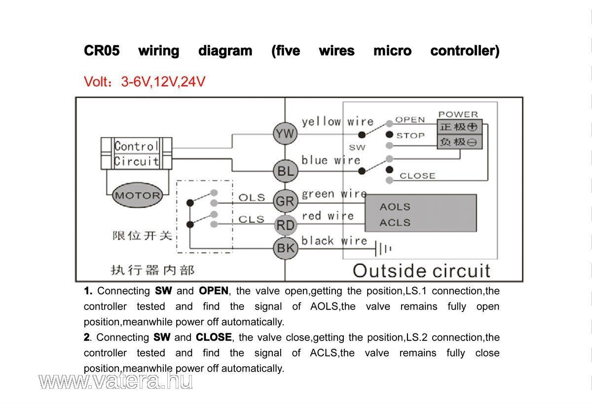 A szelepet a sárga (YW) és kék (BL) vezetékre kapcsolt egyenfeszültséggel lehet nyitni és zárni. A nyitást és zárást a feszültség polaritása dönti el. Ha sárga a pozitív és kék a negatív, akkor nyitni fog, ha kék a pozitív és sárga a negatív, akkor pedig zárni. A szelep a fekete-piros-zöld vezetéken kontaktus segítségével ad visszajelzést a nyitott és zárt helyzetéről. Amikor teljesen zárva van, akkor a szelep összeköti a fekete és piros vezetéket, amikor pedig teljesen nyitva van, akkor összeköti a fekete és zöld vezetéket. Idézet: „Meg azt is, ha abban is segítene hogy hogy oldjam meg, hogy a termosztátom 230v-ot kapcsolgat, ezt meg 12v-al kellene vezérelni, illetve működtetni.” Valószínűleg a termosztátodban érintkező kapcsol, azzal kapcsolhatsz 12V-ot is. Hogy ez kivitelezhető-e az attól függ hogyan van vezetékelve a termosztátod (lehet hogy kevés az ér). A polaritás váltás szükségessége miatt azonban egy relére valószínűleg kelleni fog. Akkor a relé lehet 230V-os és annak érintkezője fogja a 12V-ot kapcsolni a szelep számára.