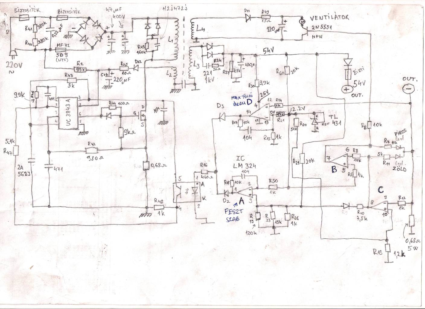 Sziasztok! Proli007 Te írtad,hogy valami nem fer azon az általam készített rajzon. Átellenőriztem,és igazad volt.Most már biztosan így néz ki.Még mindig nem találtam meg,hogy miért nincs töltőáram.Akksi nélkül 54 Volt a szekunderen,ha ráteszem az akksikat,lecsökken 50 Voltra(4 drb akksi feszültségére),de nem indul tölteni,csak a zöld led világít.Akksik jók.Lemértem multiméterrel az LM324-en a feszültségeket.Műszer fekete zsinór-szekunder földre tettem,a pirosat pedig a lábakra.Eredmények:1-es lábon=0 Volt.2=+2.42 Volt,3=+2.26 Volt,4=+25.4 Volt(táp),5=+2.2 Volt,6=+24 Volt,7=0 Volt,8=+25 Volt,9=0 Volt,10=0 Volt,11=-táp,12=0 Volt,13=0 Volt,14=0 Volt.A TL431-es REFERENCIA és KATÓD lábon 2.1 Vopltot mértem. Szerintetek mi lehet a gond?(ezeket akksi nélkül mértem) Akksival kellene?