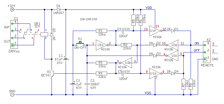 Hello! Megrajzoltam. Mindössze annyi a dolgod, hogy a REMOTE csatlakozó három vezetékét, összekötöd egy ugyanilyen másik fokozattal. Ha esetleg zavarérzékeny lenne, akkor lehet, hogy az R7 és R8 ellenállásokkal egy -egy 100nF-ot kell párhuzamosan kötni. A hat inverter természetesen egyetlen CD40106-os tokban van. Arra ügyelni kell, hogy összecsatlakozás előtt, a két készülék földelése (GND) már össze legyen kötve! üdv!
