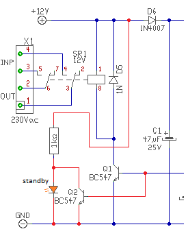 Akkor építek egy 12V-os segédtápot, ami a 230V csatlakoztatása után ellátja ezt a kis áramkört, és ez gombnyomásra indítja/lekapcsolja a főtápot. Még annyi kérdésem lenne, hogy mindezt kiegészíteném egy standby jelző 3mm normál LED-el, ami mutatja, hogy áram alatt van a berendezés, de a főtáp indítása után kialszik. Próbáltam a kapcsolási rajzot kiegészíteni, de nem tudom, így jó-e ? (A főtáp 1000W körül lesz, relének valami 12V-os Omron relét gondoltam). Üdv, zoka.