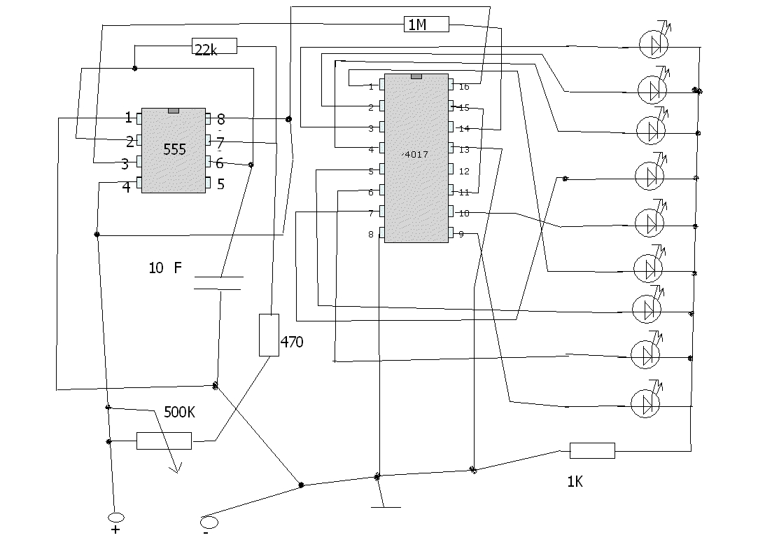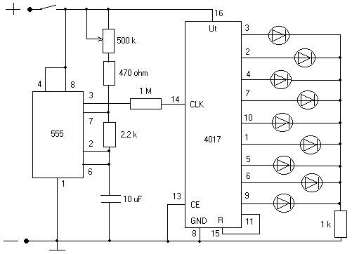 Ahol az IC-ből kijönnek a kivezetések, ott rögtön van mindegyik vonalon egy szám. Ez a szám jelöli, hogy az IC (ami mellesleg egy 4017-es típusú) melyik lábának felel meg az a kivezetés.