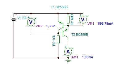 Az elektródákat kellene egy 47k ellenállással összekötni, azon helyes galvanizáló áram esetén 47V fog esni. A 75mA-től természetes, hogy a LED a veszteséglistára került, és hiányában nem jön létre semmilyen áramfolyás. Az áramkör félig-meddig azért működik, az R1-en ott az 1mA! Ennek kéne a kollektorán is kijönni, ha minden klappol. A két PN átmeneten együttesen mért 1,43V (ha jól mértél) viszont túl sok. Jó lenne látni, hogyan is néz ki amit építettél.