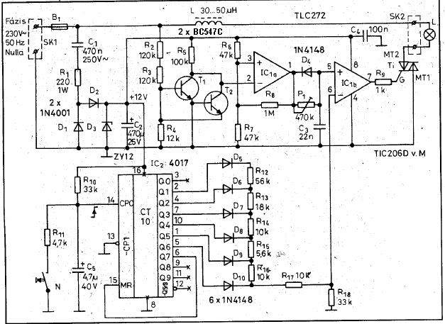 A mellékelt kapcsolással lenne gondom. Csak az egyik (pozitív) félperiódust adja ki az izzónak. Mi lehet a probléma? Halott a triak? G-MT1 között 70 Ohm mérhető. Amúgy izzót szépen szabályoz, poti van rá kötve jelenleg, de majd pic lesz. Kefés motort kéne szabályoznia, úgyhogy nem túl jó dolog, hogy csak a fele szinusz megy ki.