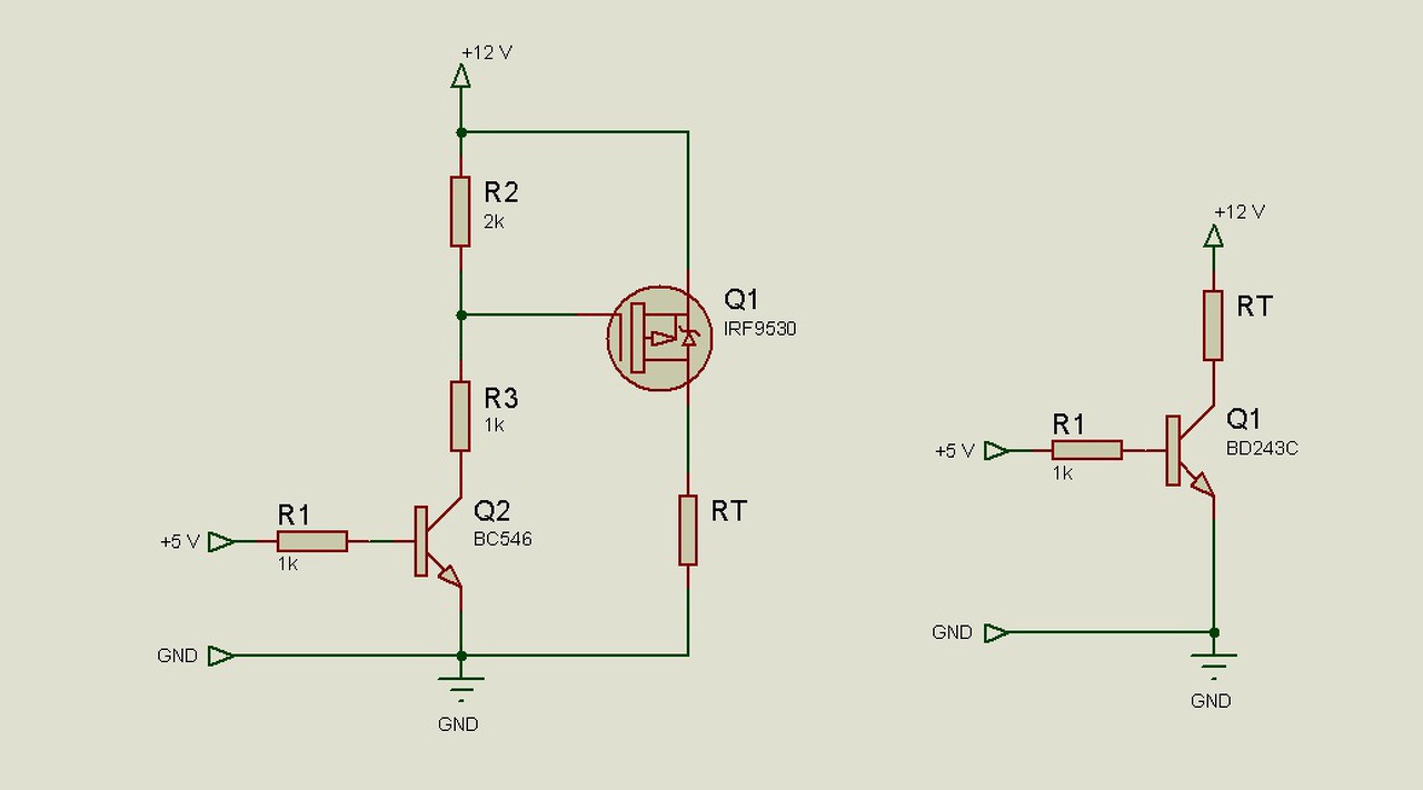 Ha mindenáron tranzisztorozni akarsz, én így csinálnám. Két lehetőség, a második kevesebb alkatrészt igényel igaz, ekkor a fogyasztó egyik ága mindig a +12 V-on van. RT jelenti a fogyasztót, jelen esetben a LED-eket.