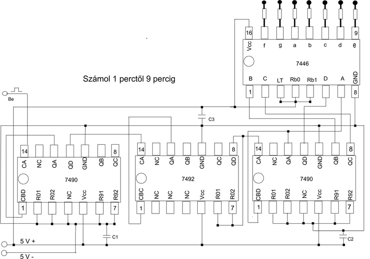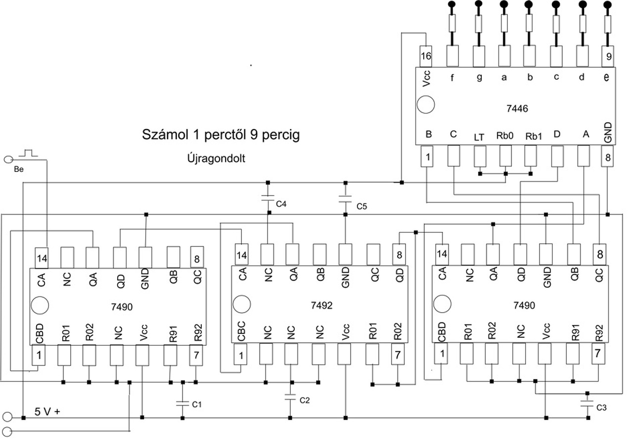 Igen, erre lettünk volna kíváncsiak, hogy a szegmenseket mi hajtja. A 7447 ha jó, nem tud olyan jelenséget, mint amit írtál. Kipróbálhatod, hogy a 7447 bemeneteit leválasztod a 7490-ről és a 7447bemeneti lábaira adsz +5v.ot és gnd-ket, (a bemenetek nem lebeghetnek), akkor működik e helyesen, (az a -5v-os felirat az nem jó) Én ettől az ic től nézném át a vezetősávokat, forrasztásokat, gyanta maradványokat stb..