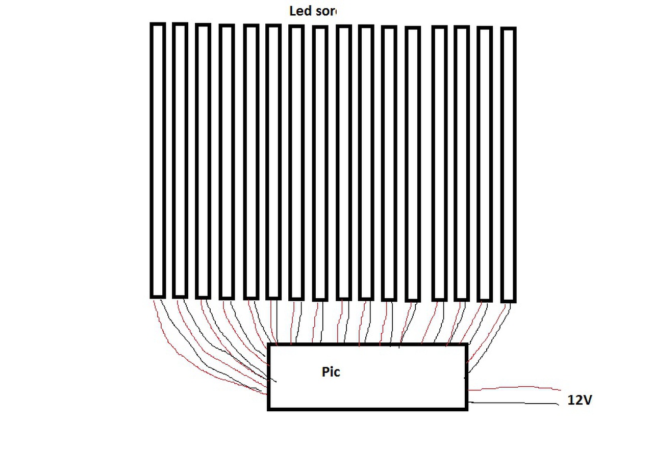 Sziasztok! Szeretnék csinálni egy olyasmit hogy led szalagokat,(több színű) külön megvilágítani,de úgy hogy fusson végig rajta a fény a szalagon próbáltam csinálni egy képet hogy mégis milyen(persze a szalagok másképp lennének elrendezve) tehát mondjuk végig fut a 2 kék csíkon,aztán a két piros (stb) meg majd akár az összesen is egy idő után. A kérdés hogy ez Pic-el megvalósítható e? Van e ilyen kapcsolási rajz? Ha valaki tud ilyet megköszönném. A PIC felprogramozás az megy. Választ előre is köszönöm!