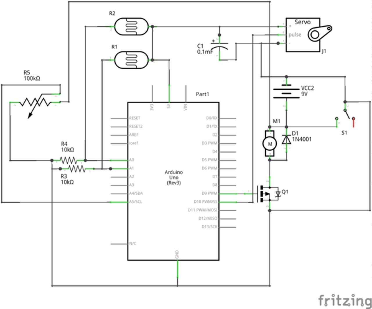 - A rajz egyébként nem értelem szerű. Oly kusza, hogy nézegetni kell, mi hova van kötve. Az R5 poti pld. 9V-ot kapna, az UNO meg 5V-ot? Valami stabi kellene az UNO számára. (Gondolom a Servo is arról járna.)