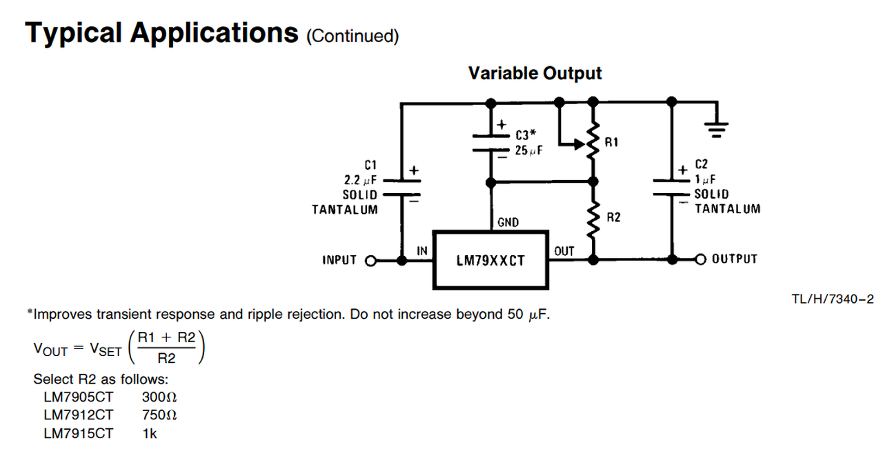 Egy lineáris feszültség stabilizátor IC (7905) kimeneti feszültségét szeretném szabályozni. Sokféleképpen lehet, én a képen is látható feszültségosztóval szeretném megoldani. Az lenne a kérdésem hogy az R2-höz miért ajánl 300 ohmot? 1k-ohm os ellenállással is működne?