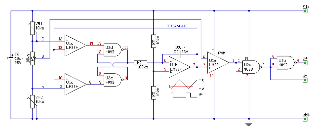 Készítünk egy háromszögjelet, aminek csúcsfeszültség értékei, megegyeznek a poti alsó és felső feszültségértékével. Ha a háromszögjel pillanatértékét összehasonlítjuk egy komparátor segítségével a potméter csúszka feszültségértékével, akkor egy impulzusszélesség modulált jelet kapunk, melynek kitöltési értéke arányos lesz a poti csúszka állásával. Ha a PWM impulzus amplitúdója állandó, akkor az impulzus átlagértéke arányos lesz a poti állásával. Ezt (pld. leosztva) rávezethetjük a műszeráramkörre. A DVM átlagolni fogja az impulzusokat, mert a legtöbben integráló AD működik. De ha "egyenfeszültséget" szeretnénk, akkor integrálni kell a PWM jelet. Az áramkörnek két kimenete van, egyik egyenesen arányos lesz a poti állásával, másik fordítottan arányos lesz. Természetesen nem lehet a mért poti teteje és alja tetszőleges értéken a 0..12V tápfesz között, mert minden műszaki megoldásnak van működési határa. Itt pld. a műveleti erősítők bementi és kimenti feszültségének tartománya és működési sebessége fog határt szabni. És minél közelebb lesz a poti teteje és alja közötti különbség a hibák úgy fognak növekedni.